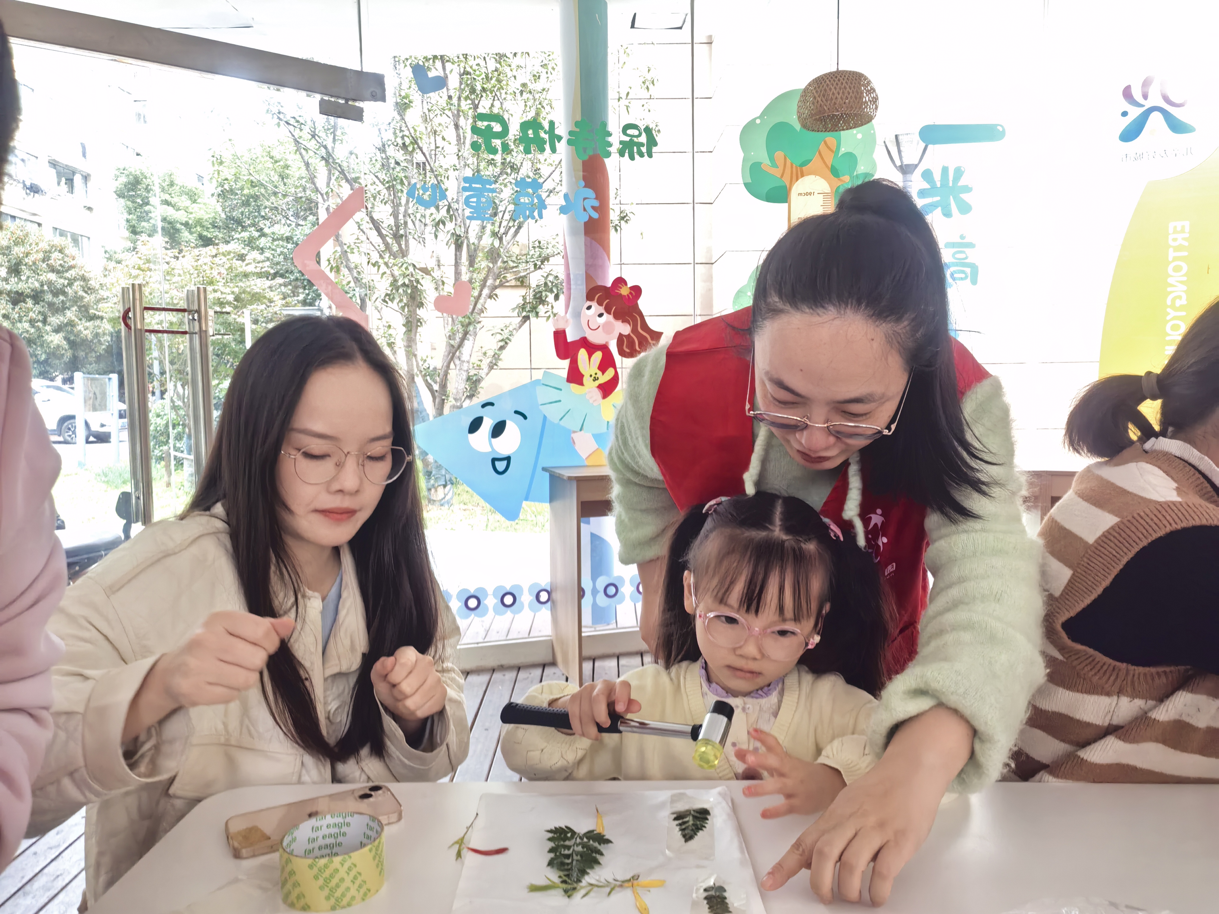 正值多彩秋季时节,整体活动借助“趣味植物拓染”,链接三方共建合作。整个活动过程中,社区工作人员现场讲解拓染技巧,孩子们在家长们的陪伴下尝试着用小树叶拼摆出自己喜欢的造型,用安全锤轻轻敲打,把秋天植物特有的花纹留在布袋上。无锡市新惠幼儿园的党团员教师们则化身“共育导师”,或蹲在孩子身边,手把手指导他们固定叶片;或与家长交流亲子互动技巧,分享植物染背后的传统文化知识等......整体活动现场,家园社三方其乐融融,共同为孩子们营造着温馨的活动环境,体验着携手活动的乐趣,同时伴随着布袋上逐渐显现出的植物纹路,一种自然物与传统文化融合与传承在家园社协同共建中得到传递。